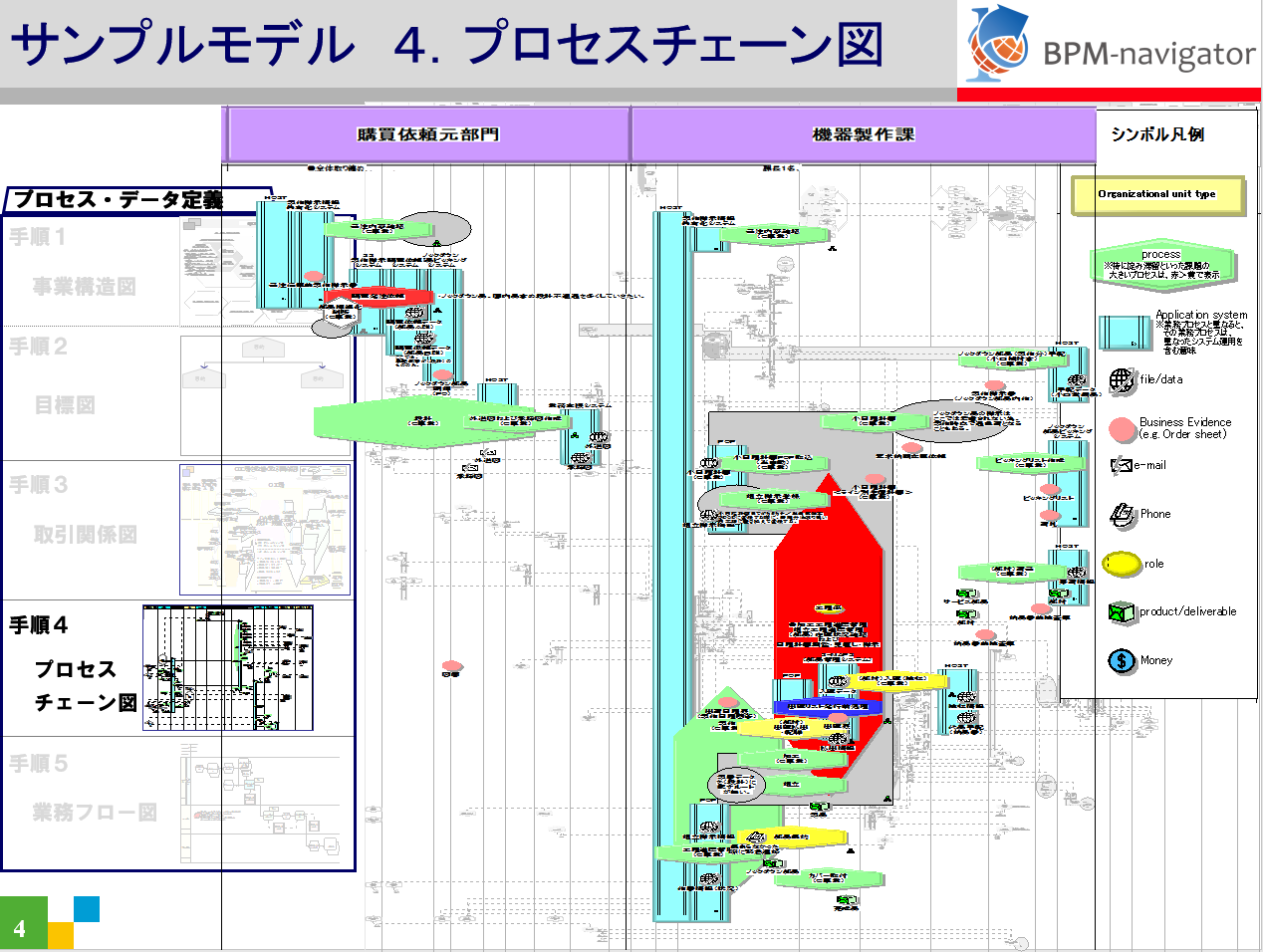 | 手順4 | (取引関係図上の)プロセスチェーンを捉える:(伝票、証憑/データ/物/お金といった) 物理的な入出力媒体が繋がる先となる業務プロセスを漏れなく捉えるために、必要不可欠。 | プロセスチェーン図 |