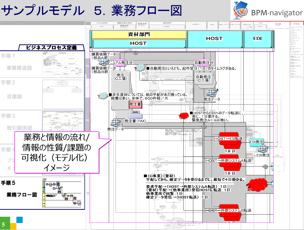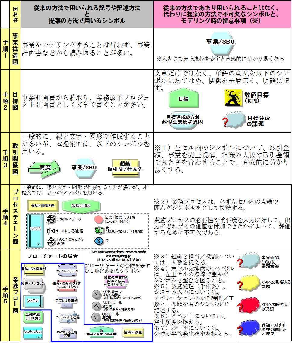 | 手順5 | 業務プロセスの内容と課題を捉える:目標達成を阻害する要因や事象を捉えるために必要不可欠。 | 業務フロー図 |